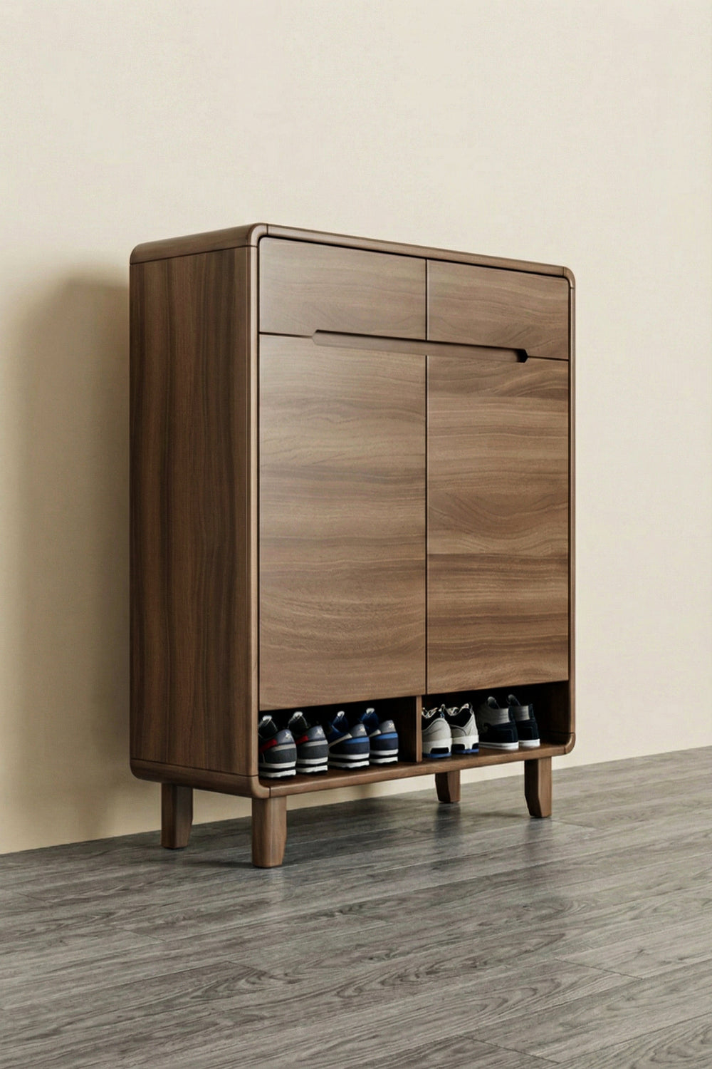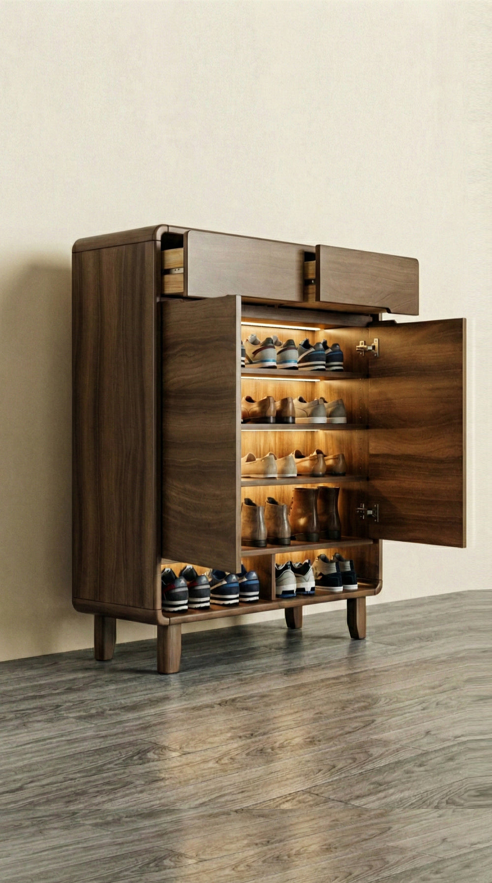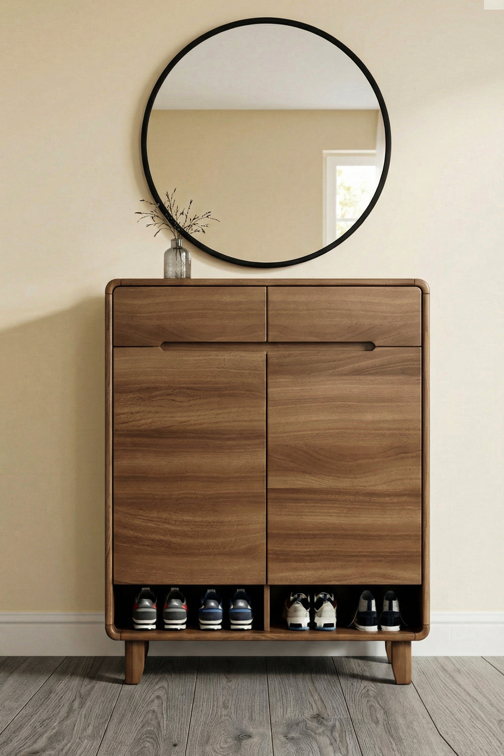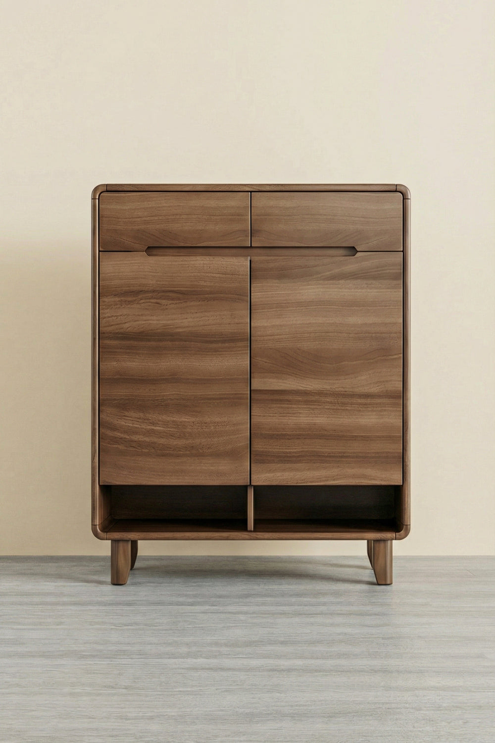Two open storage boxes at the bottom for shoes or decorative items