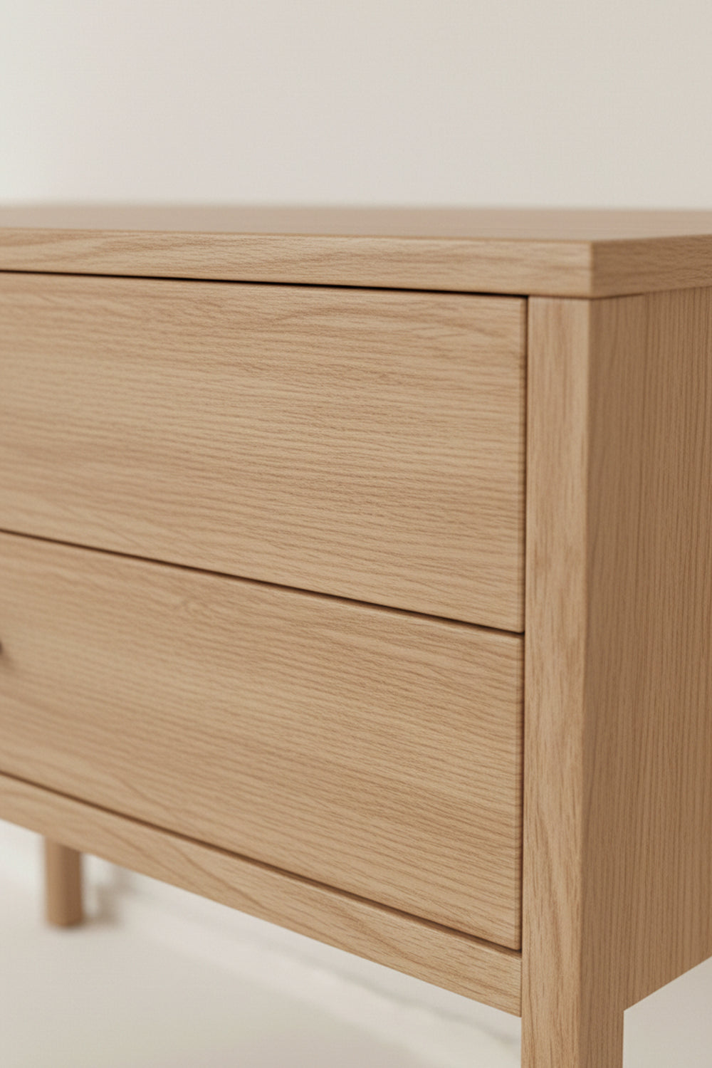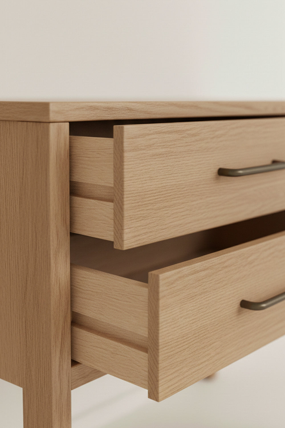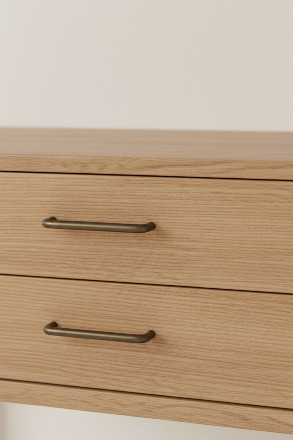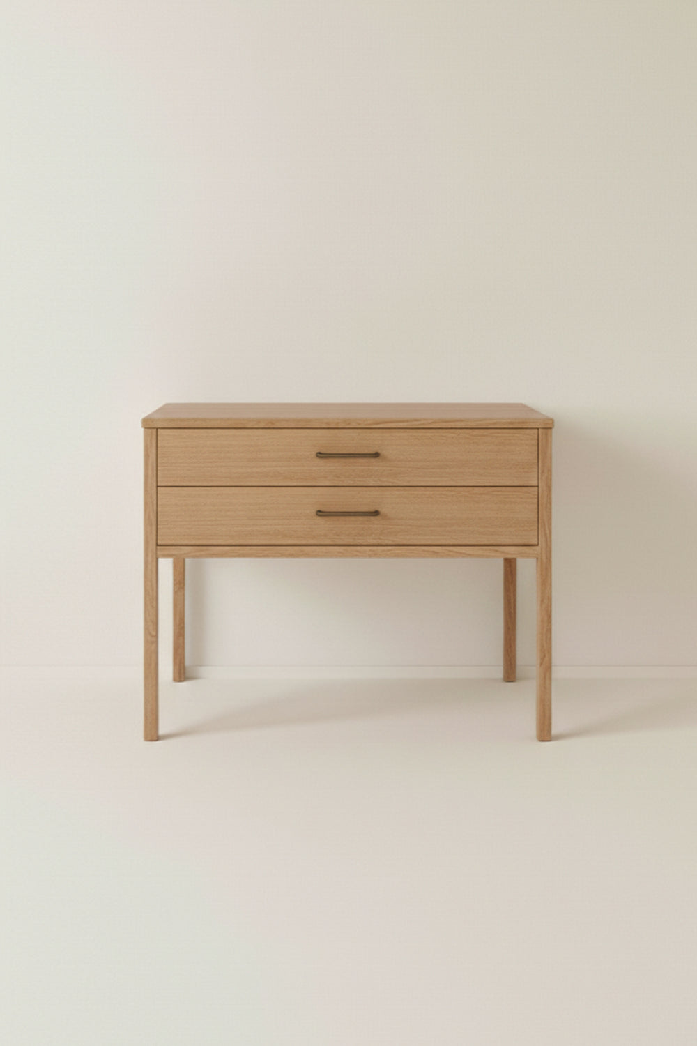 The Breeze is designed to provide essential storage without crowding your space. Featuring an elevated "airy" frame and a warm light-oak finish, it’s the perfect addition to narrow hallways, bedrooms, or even as a minimalist home-office desk. The two wide, smooth-gliding drawers offer a clean solution for tucking away essentials while keeping the top surface free for your favorite decor.