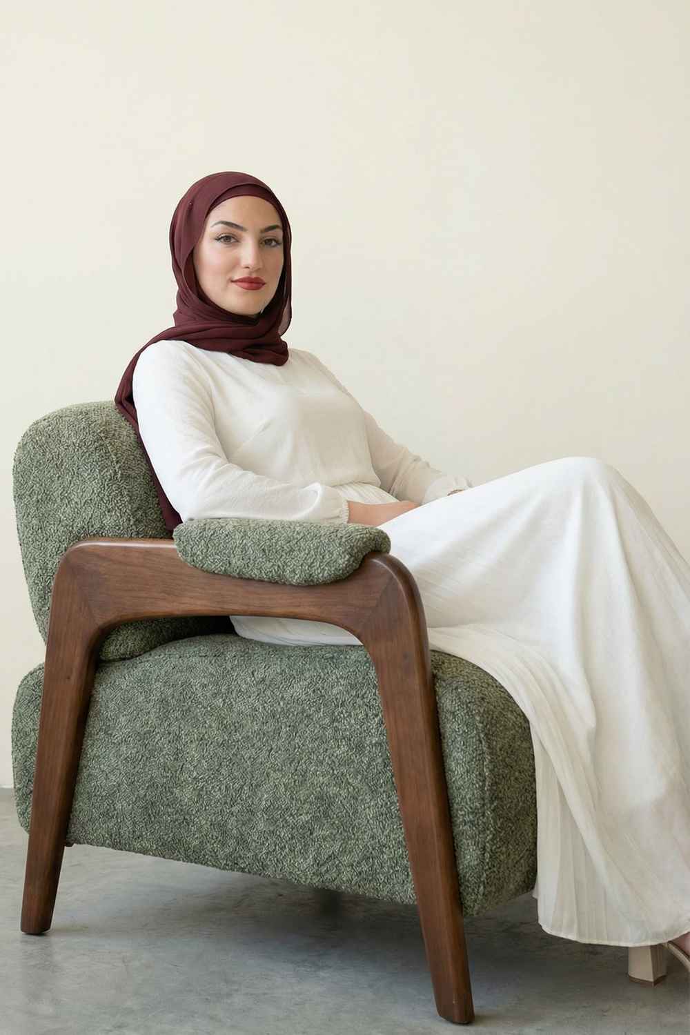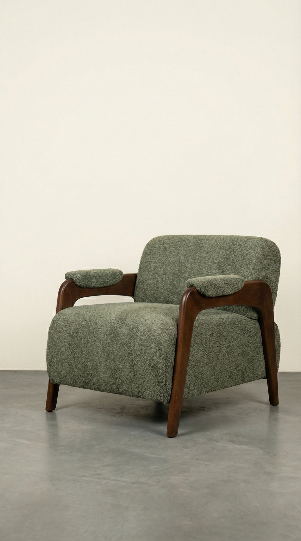 The Olive Fauteuil is a statement piece that redefines comfort through a classic French lens. Designed for those who appreciate the finer things, this chair features a deep, earthy green bouclé upholstery paired with an architectural solid wood frame. Its wide, welcoming arms and plush cushioning make it the ultimate "throne" for your modern sanctuary.