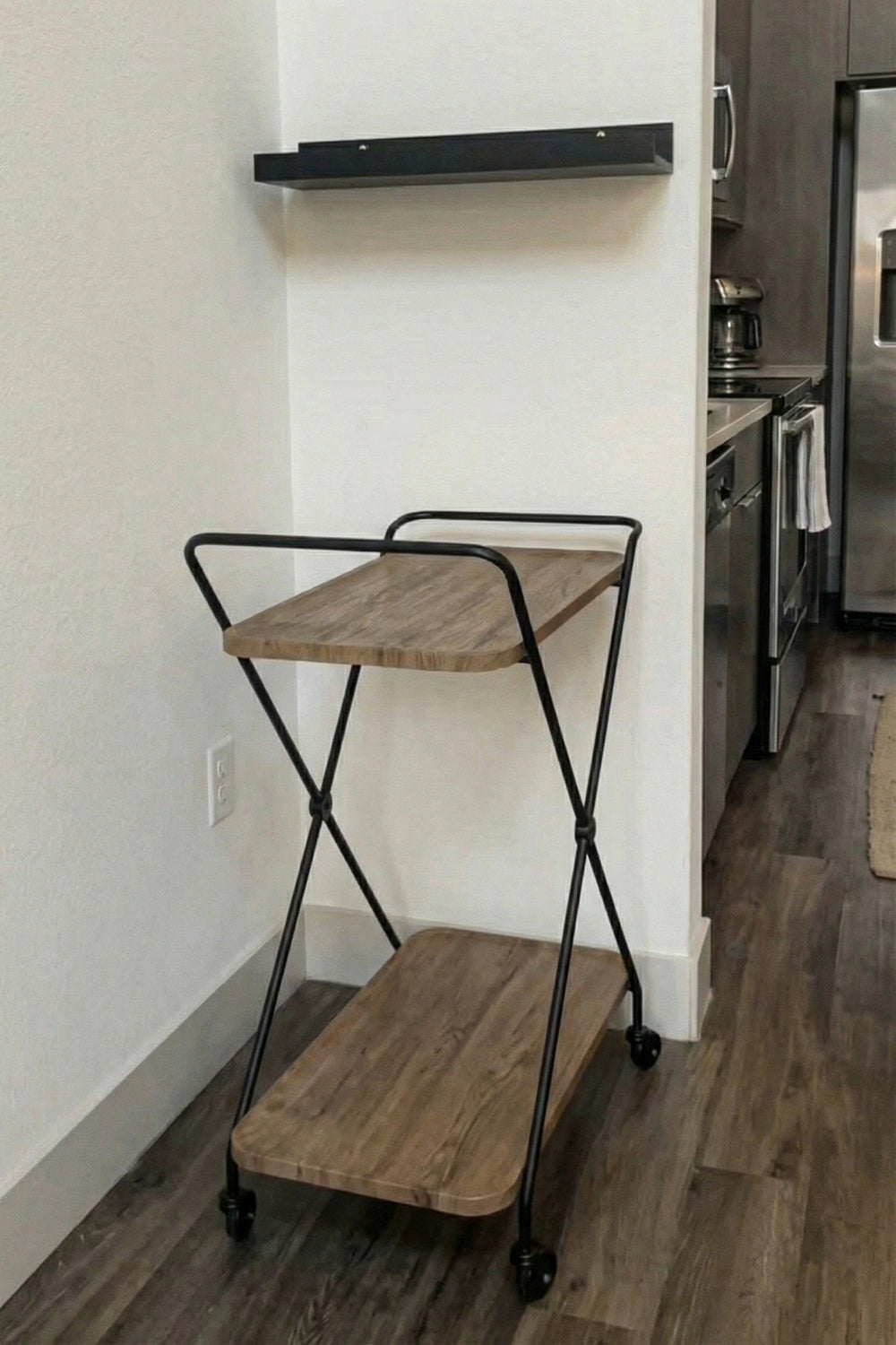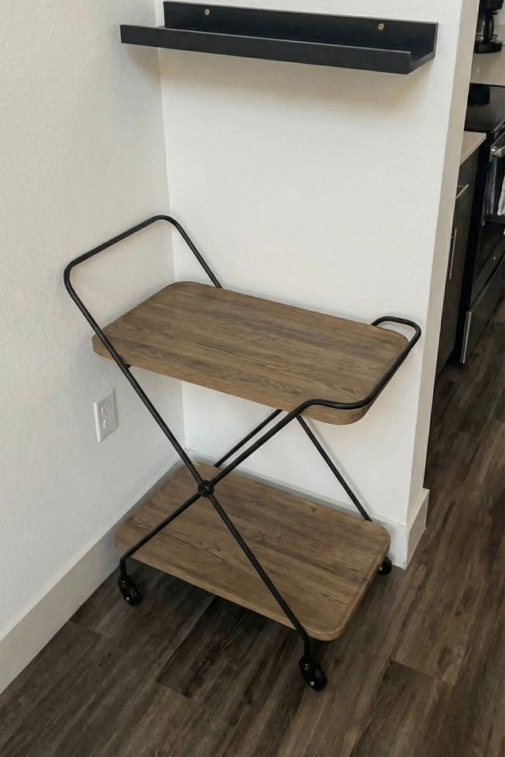 A highly practical, space-efficient solution for your daily coffee setup or hosting needs. Designed with a minimalist industrial approach, this two-tier trolley features an open X-frame construction. This specific design choice keeps the visual space airy and light, making it the perfect fit for narrow hallways, tight kitchen corners, or small dining nooks without making the room feel crowded.