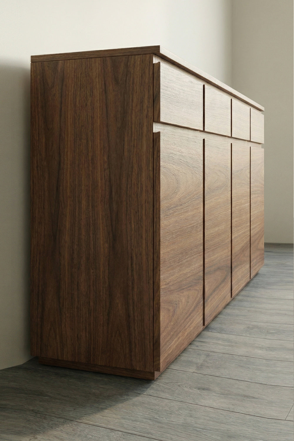 Handle-less Profile: Features precision-cut gaps for a flush, modern look that highlights the natural walnut grain.