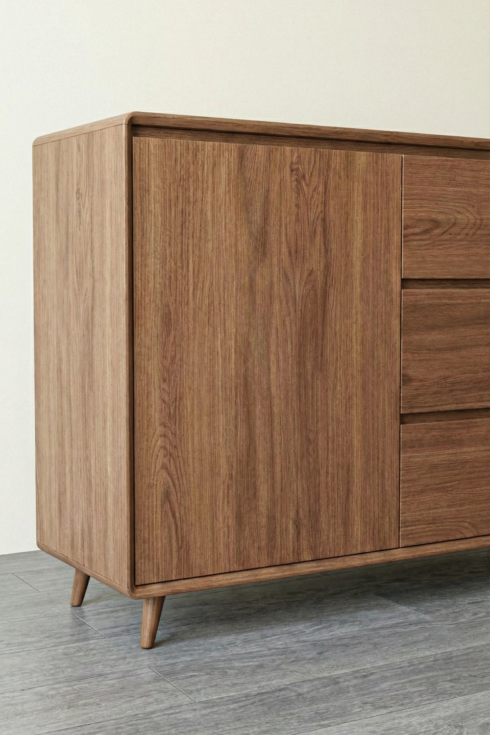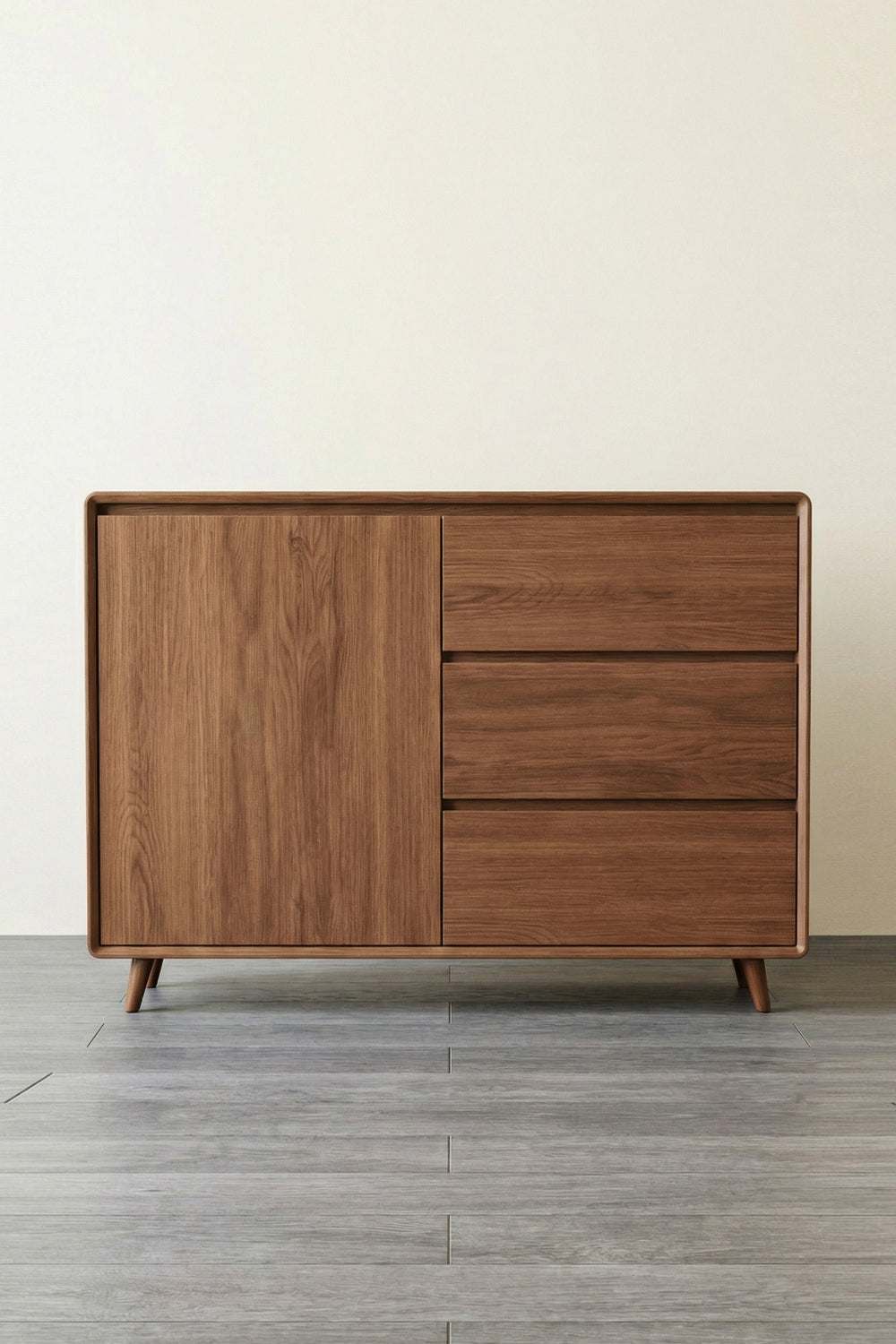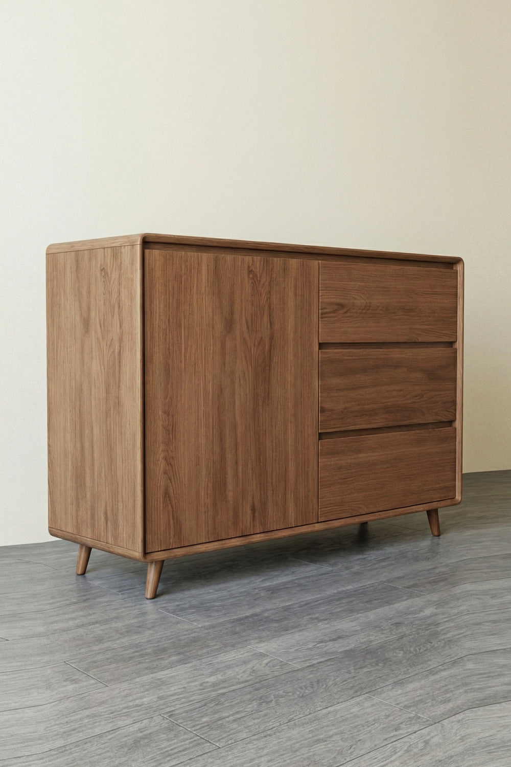 This cabinet is defined by its smooth, rounded edges that give it a sophisticated, "soft" feel despite its sturdy build. With a rich walnut-tone finish and iconic tapered legs, the Vault Cabinet is designed to be both a functional storage unit and a centerpiece for your modern interior.